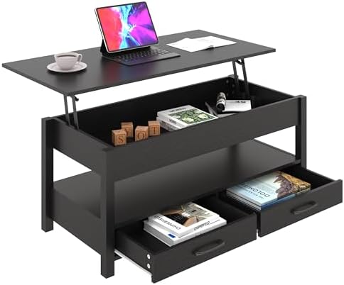 View full detailsPanana Coffee Table, Lift Top Coffee Table with Hidden Compartment, 2 Drawers and 1 Open Shelf, Retro Central Wooden Table Lift Tabletop for Living Room (Black)
