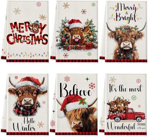 View full detailsPreboun 6 Pcs Christmas Kitchen Towels Highland Cow Decorative Hand Towels Red Black Plaid Hello Winter Merry Christmas Dish Cloth Farmhouse Tea Cloth Kitchen Accessories Bathroom Decor