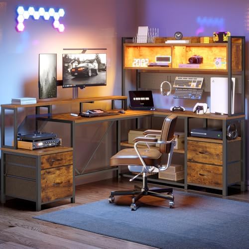 View full details75inch L Shaped Computer Desk with Drawers, Large Gaming Desk with LED Light & Power Outlets, Corner Computer Desk with Storage Shelves & Monitor Stand for Home Office,Rustic Brown and Black