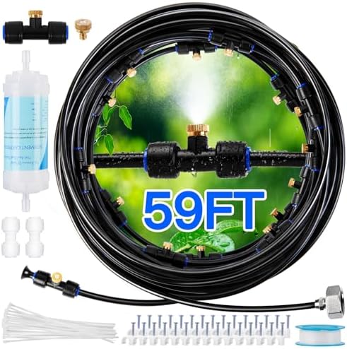 View full detailsMisters for Outside Patio with Water Filter - 59Ft(18M) Misting system Line 20 Brass Mist Nozzles Brass Adapter(3/4") Patio Misters for Cooling Outdoor Greenhouse Backyard Porch Garden BBQ Party Pool
