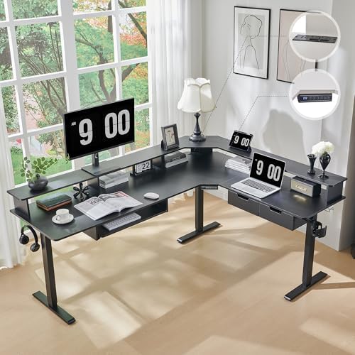 View full detailsRedLemon 75X60 Inches L Shaped Electric Standing Desk, Height Adjustable Corner Gaming Desk with Drawers, Power Outlets & LED Lights, Computer Desk with Monitor Shelf, Carbon Fiber Black