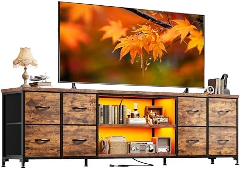 View full details63" W TV Stand for 55 65 75 Inch with Lights & Power Outlets,Dresser for Bedroom with 8 Chest of Drawers, Fabric Long Dresser As Entertainment Center for Living Room,Dorm,Bedroom,Rustic Brown