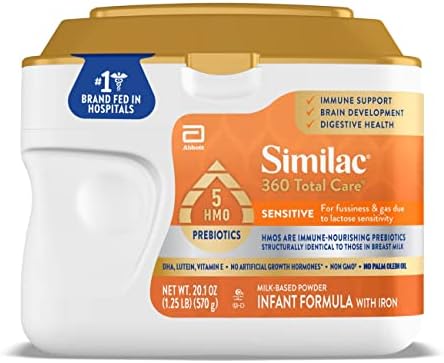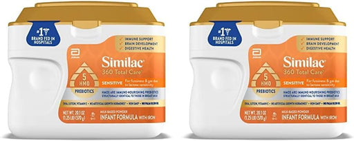 Similac 360 Total Care Sensitive* Infant Formula with 5 HMO Prebiotics, for Fussiness & Gas Due to Lactose Sensitivity, Non-GMO, Baby Formula Powder, 20.1-oz Tub (Pack of 2)