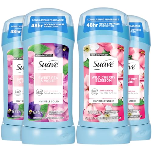 View full detailsSuave Antiperspirant Deodorant for Women, Wild Cherry Blossom + Sweet Pea & Violet Variety 4-Pack – Anti-Staining Invisible Solid Sticks, Talc-Free, 2.6 Oz Ea