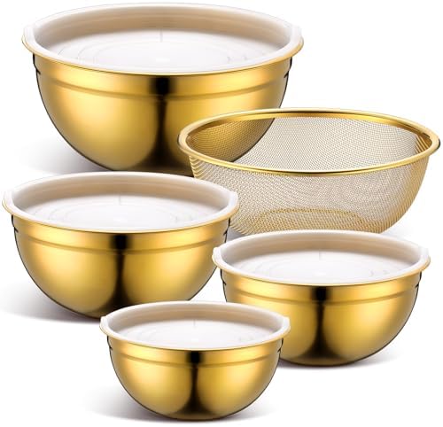 View full detailsGold Mixing Bowls with Airtight Lids Stainless Steel Mixing Bowl Set of 5, 4 Metal Nesting Organizers 4 in 1 Colander Non-slip Bottom Size 1.5, 2.0, 2.5, 4.0 Qt for Baking Serving Food