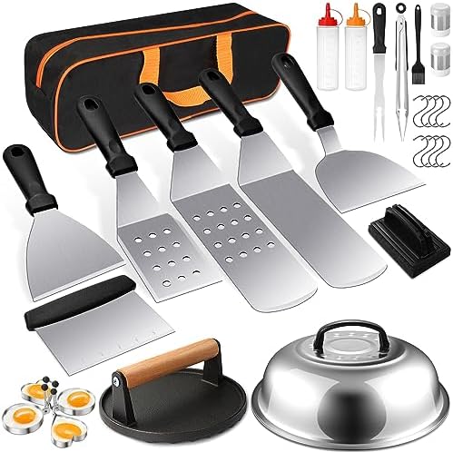 View full detailsGriddle Accessories Kit, 28 PCS Flat Top Grill Accessories for Blackstone and Camp Chef, Metal Spatula Set with Burger Press, Melting Dome, Tongs, Scraper, Carry Bag for Outdoor Grilling BBQ