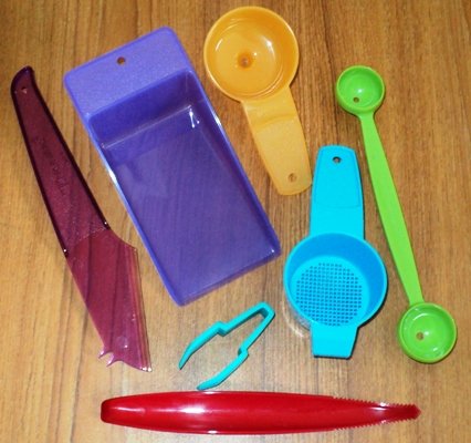 Brand: TupperwareColor: MulticolorFeatures: 7 Tupperwre Kitchen Gadgets in a variety of colors Colors May Vary from the picture Includes Mini Tea ...