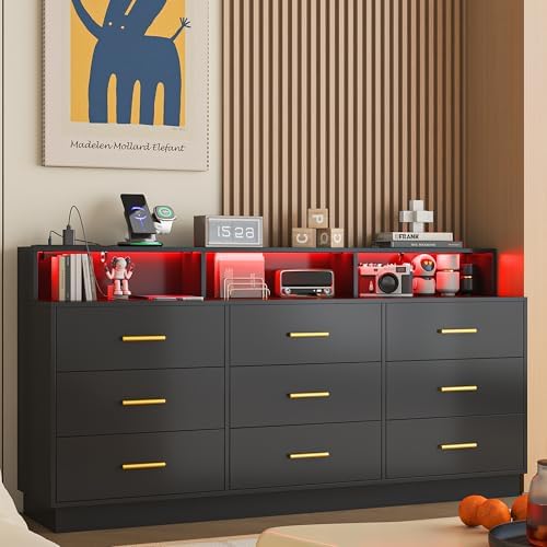 View full detailsBlack 9 Drawer Dressers for Bedroom, Modern Large Dresser with LED Light and Power Outlet, Wooden Long Dresser for Bedroom, Entryway, Living Room