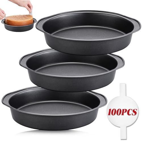 View full detailsUnokit 8" Round Cake Pan Set of 3, Carbon Steel Cake Baking Pans with 100 PCS Parchment Paper, Nonstick Cake Pans with Handle, Dishwasher Safe