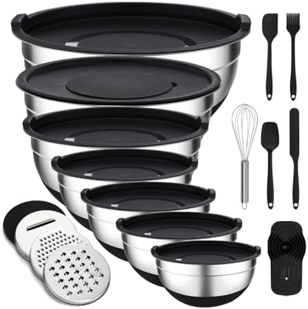 View full detailsUnokit Mixing Bowls with Lids Set, 7 Pcs Stainless Steel Mixing Bowls with 3 Grater Attachments, Non-Slip Silicone Base Mixing Bowl Set, Sizes 4.5, 4, 3.5, 2.1, 1.5, 1.1, 0.7 Qt for Mixing, Serving