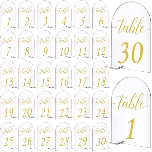 View full detailsVicenpal 30 Sets Arch Acrylic Sign Gold Printed 1-30 Table Signs with Stands Calligraphy Clear Table Number Display Stand for Wedding Reception Event Party Restaurant Centerpieces Decor (4 x 6 Inch)