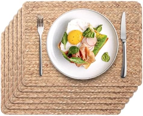 View full detailsWoven Placemats Set of 6, 17" x 12" Rattan Table Mats, Natural Water Hyacinth Chargers for Dinner Plates, Wicker Placemats for Dining Table, Home, Wedding