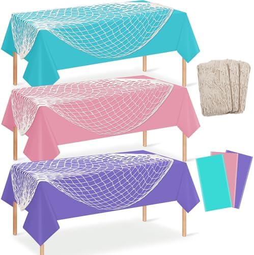 View full details3 Set 6 Pcs Fish Net and Tablecloth Set,Cotton Fishnet and 3 Color Disposable Plastic Table Cover for Mermaid,Baby Shower,Birthday,Ocean Pirate Under The Sea Party Decorations,54 X 108Inch