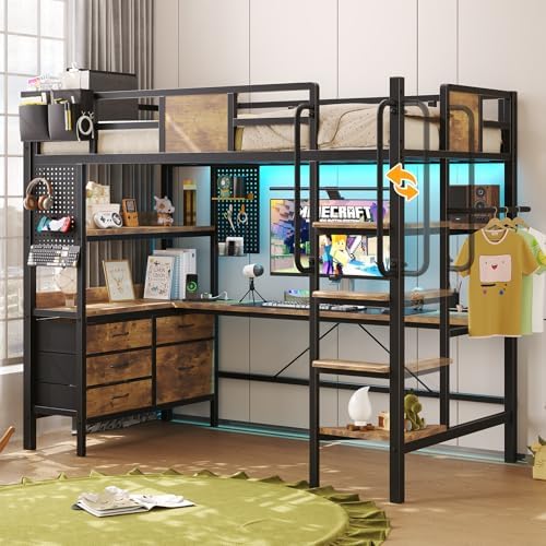 View full detailsLoft Bed Twin Size, Loft Bed with Desk & RGB LED Lights and Charging Station, Bunk Bed with Desk and 5 Storage Drawer Cabinets and 2 Open Shelves,Twin Loft Bed No Box Spring Needed,Vintage Brown
