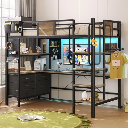 View full detailsLoft Bed Twin Size,Loft Bed with Desk & RGB LED Lights and Charging Station,Bunk Bed with Desk and 5 Storage Drawer Cabinets and 2 Open Shelves,Twin Loft Bed No Box Spring Needed,Oak Gray